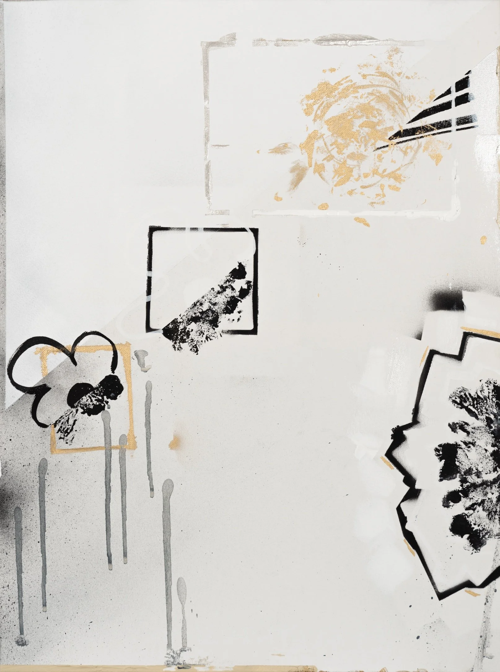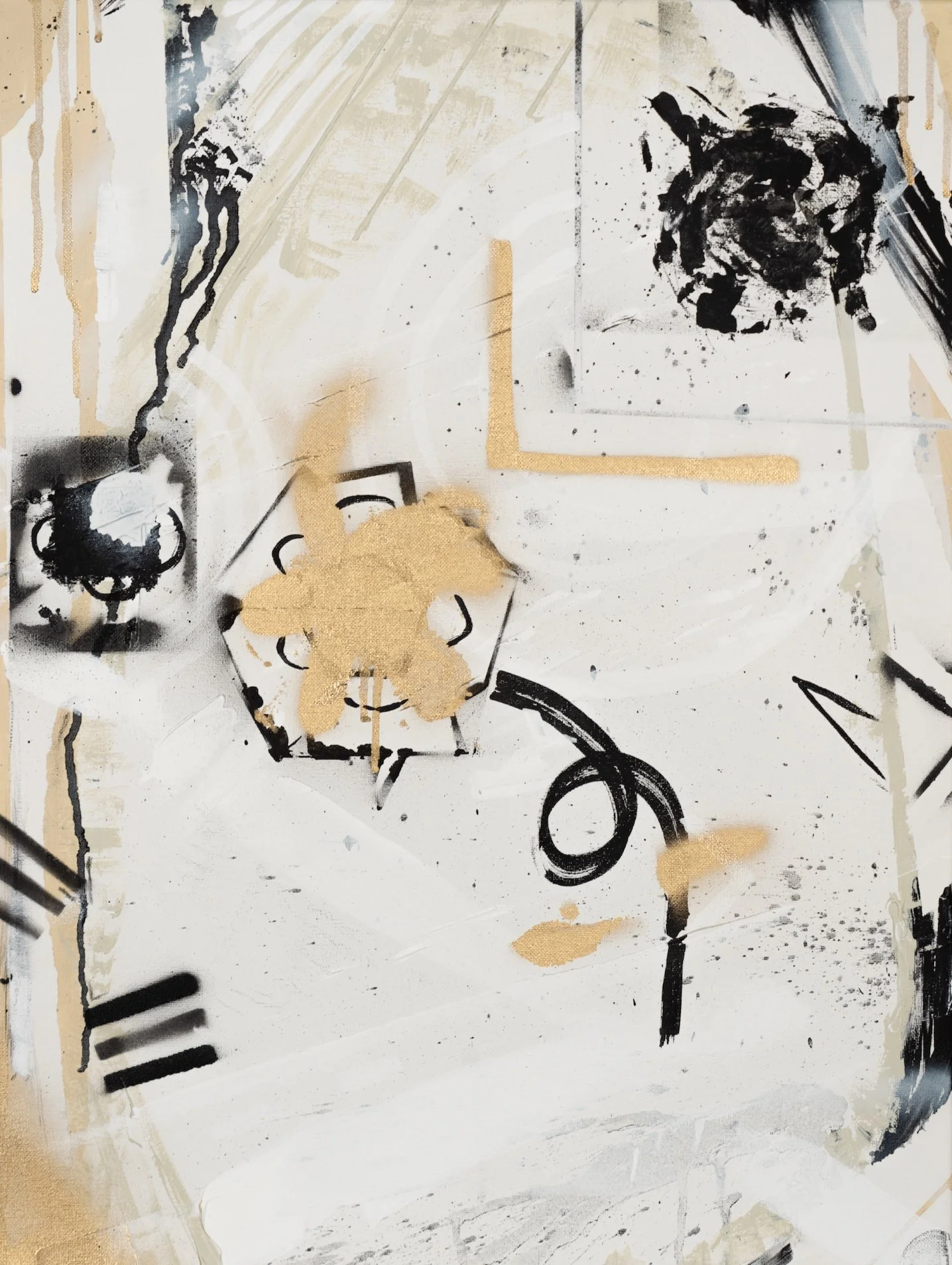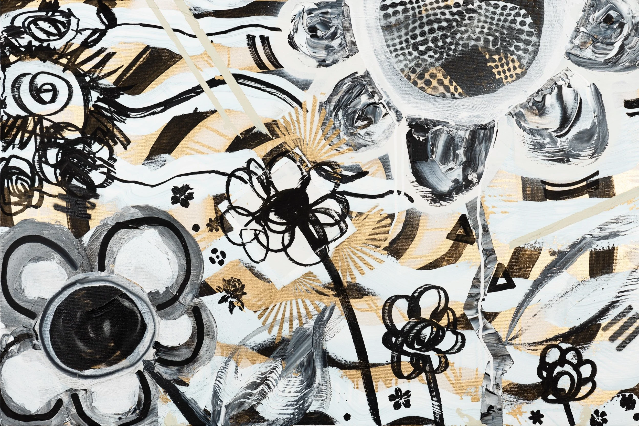 The backdrop is swirling gold spray paint which was spun while drying, layered with some wavvvvvy white, single pass flowers and thick layers of mixed acrylics (both structured and unstructured).