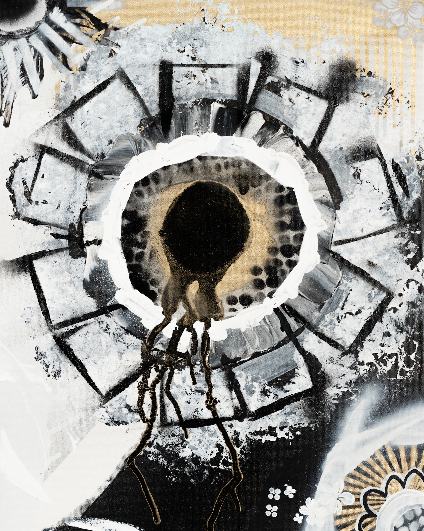Moving inward, thick stacked acrylic layers, a little disco flair, and then black on gold spray paint excess bleeding down the heart of the painting.